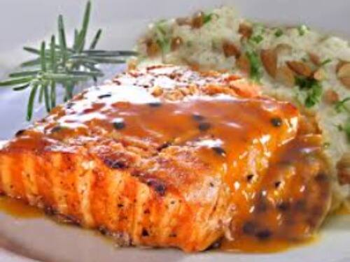 Nosso salmão ao molho de Maracujá vai em 5 marmitas*Salmões ao molho de maracujá*Arroz*Salada especial*Tomate cereja*Verdura refogada